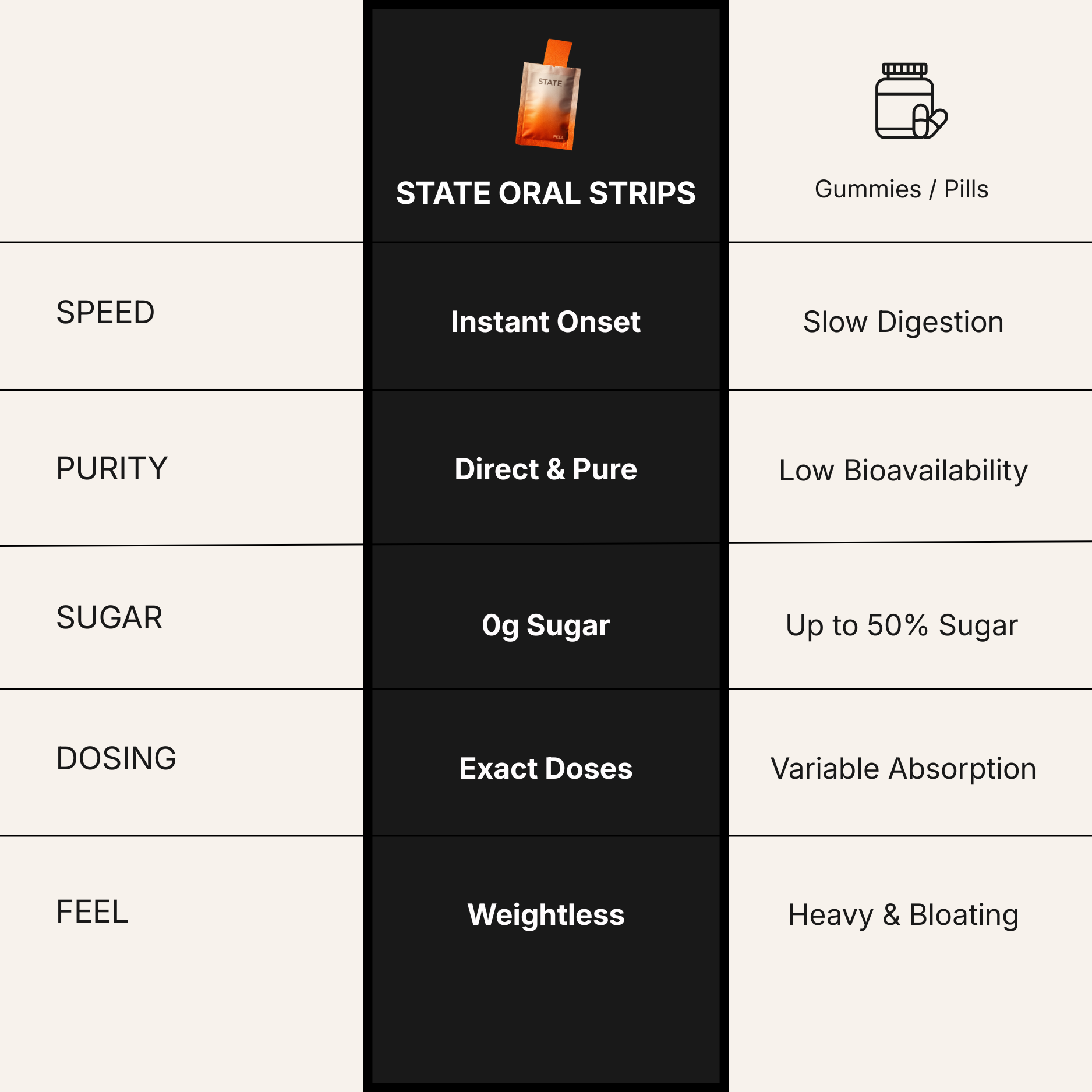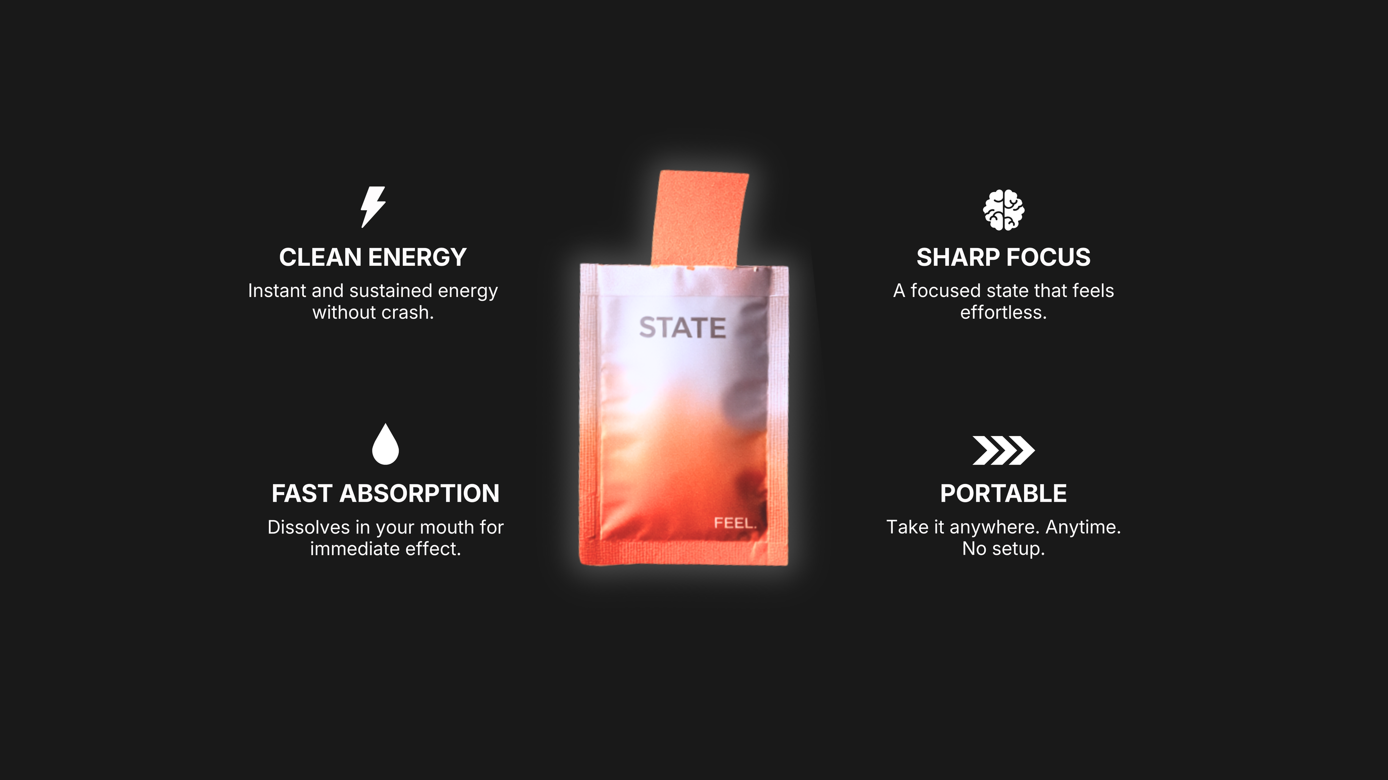 The active ingredients in STATE Strips are designed to boost your energy and focus without the jitters, whether you're working or working out. Place a tab on your tongue, let it dissolve, and feel the effects in 5-10 minutes.